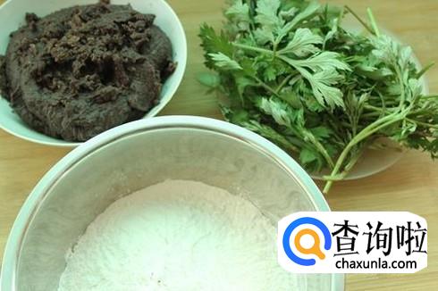 把艾草择去黄叶,清洗干净,糯米粉放盆里,做好的豆沙馅放碗里备用。