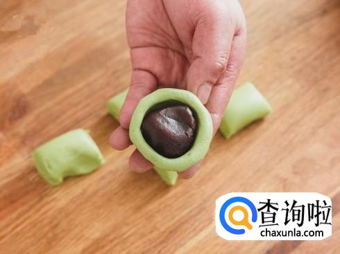 把和好的糯米面,揉匀后切成小剂子,捏成圆形面皮,再把备好的豆沙馅放入面皮中,包好揉成圆球形状。