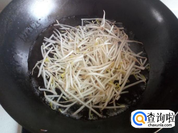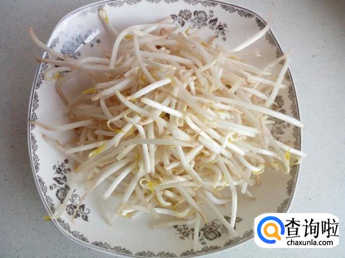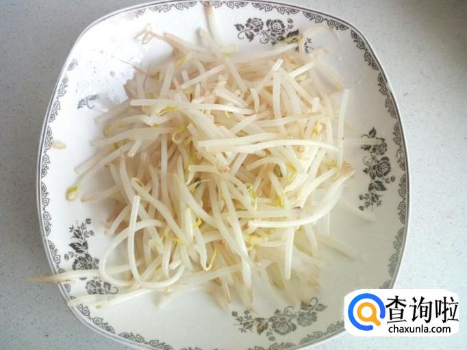 把绿豆芽放入开水中焯一下,入锅30秒钟捞出(绿豆芽透明),迅速放入冷水中过凉,淋干水分。