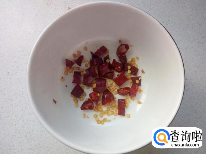 锅内放入油加热,油七,八成热时,关火。稍凉后,把油倒入切好的红干椒碗中,炸成辣椒油。