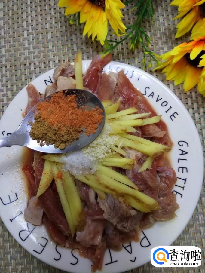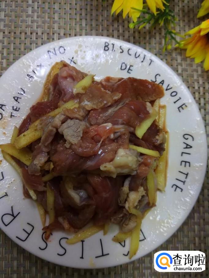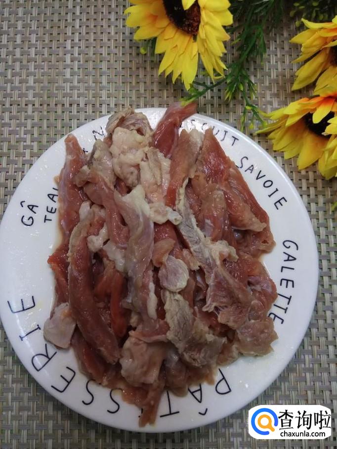 准备适量牛肉,用清水洗净,可以多洗几遍,将血水彻底清洗干净,然后切成长条,放入盘中备用。