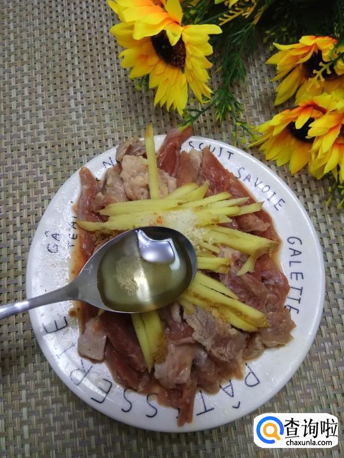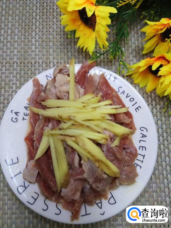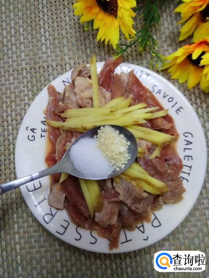 将姜切成细丝,放入盘中,再放入适量盐和鸡精。