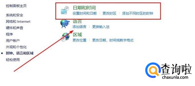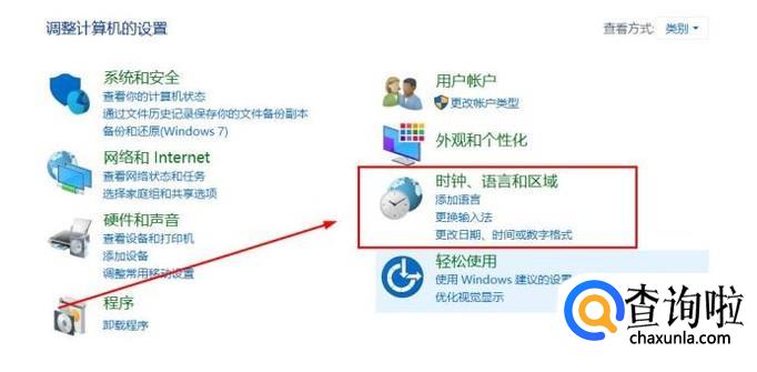 在“控制面板”的页面中,找到“时钟、语言和区域”,点击进入。