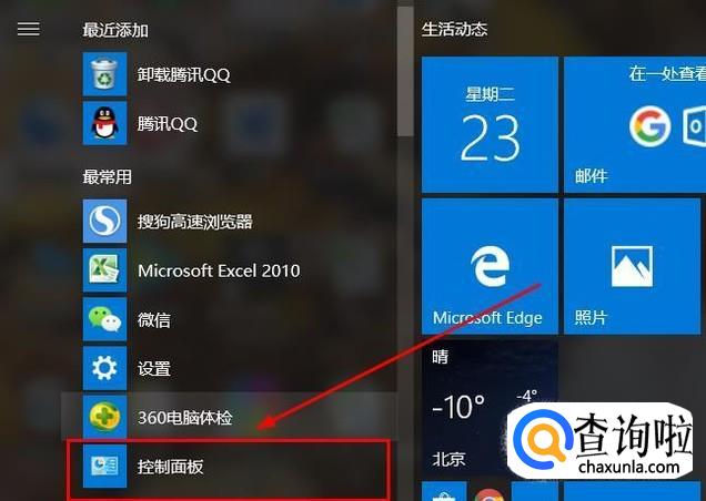 首先我们需要打开“开始”菜单栏,在其中找到“控制面板”选项,点击进入。