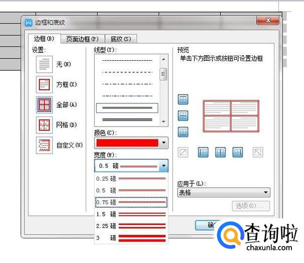 进入“边框和底纹”后,在“颜色”里面选择要调整的颜色,在“线型”和“宽度”里面可以调整表格的边框样式,调整完成后点击确定。