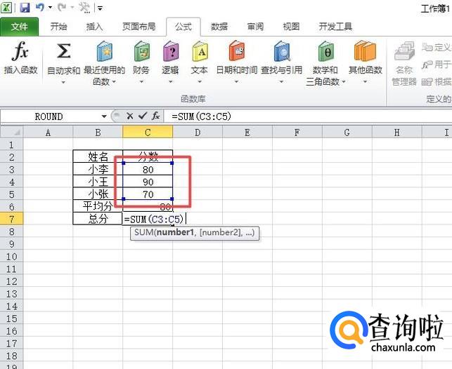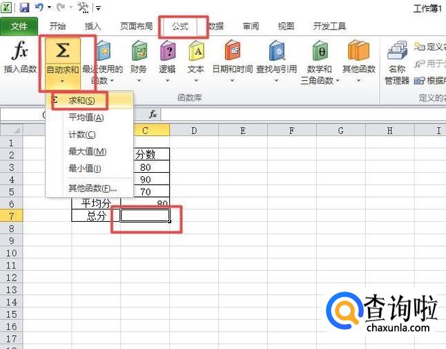 之后我们点击总分右边的单元格,然后点击公式,之后点击自动求和的下拉箭头,弹出的界面,我们点击求和;