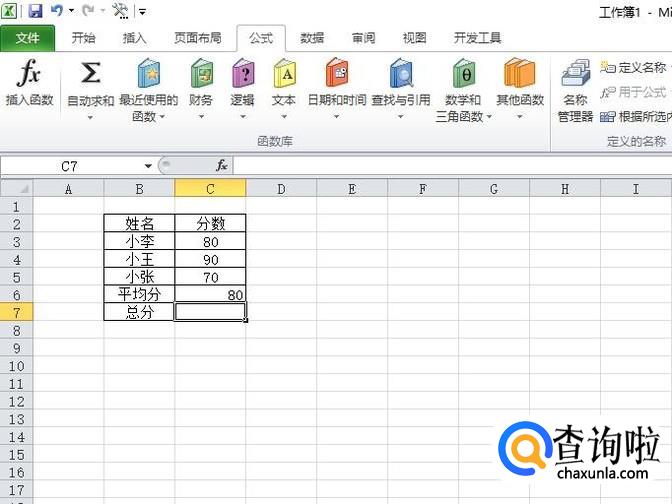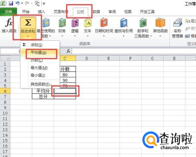 之后我们选中平均分右边的单元格,然后点击公式,之后点击自动求和的下拉箭头,弹出的界面,我们点击平均值;