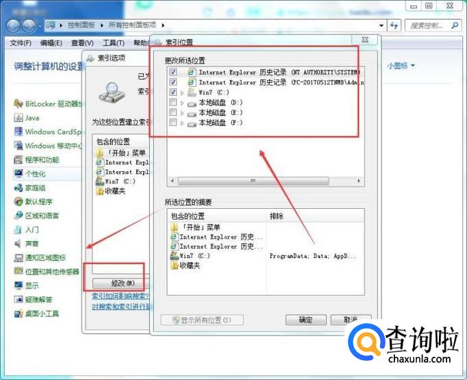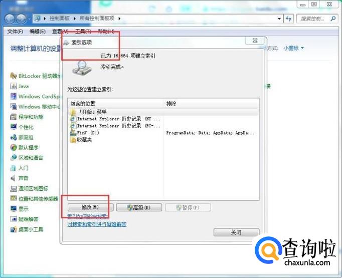 然后在【索引选项】窗口中,点击【修改】按钮,如下图所示: