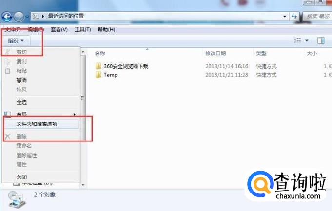 然后点击【组织】,找到【文件夹和搜索选项】,如下图所示: