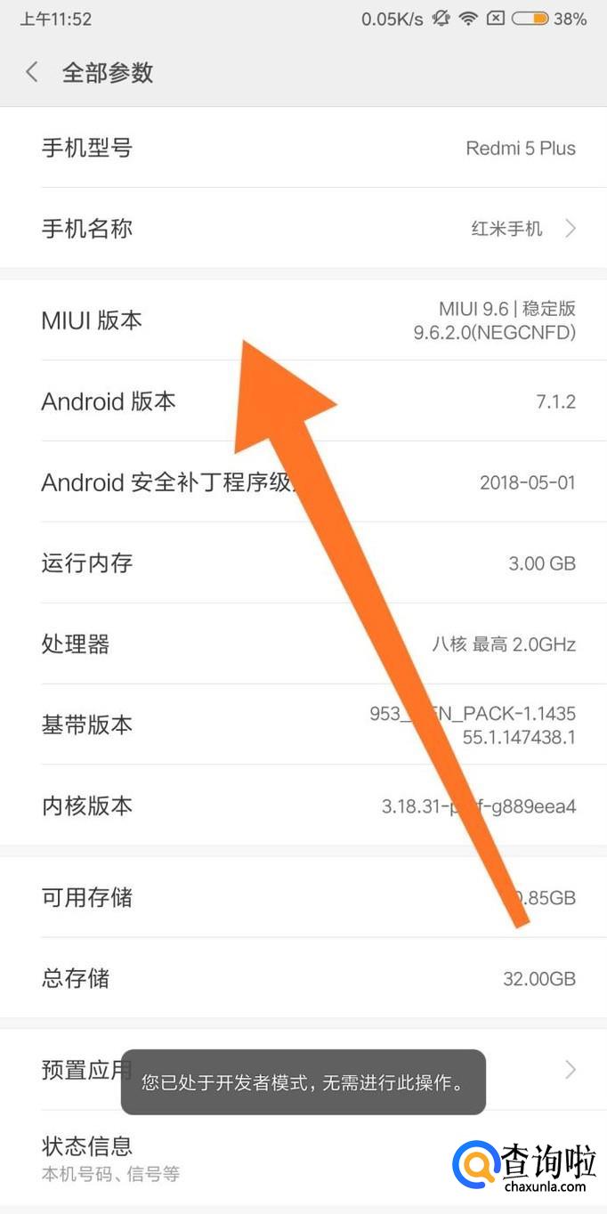 接着连续点击七次MIUI版本号,直到手机提示已经进入开发者模式。