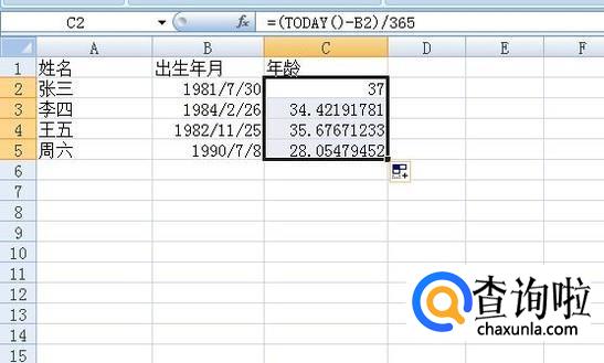然后我们下拉单元格,复制格式,得到其他人的年龄。