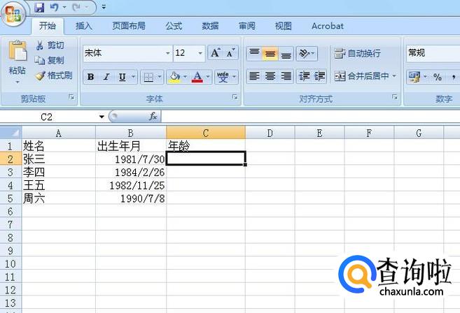 首先,我们打开excel表格,如图所示,任意输入姓名和出生年月做演示用,我们需要在C列输出他们的年龄。