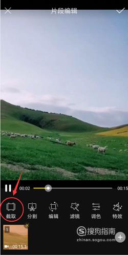 在片段编辑页面,有诸多的编辑功能,如截取、分割、编辑、滤镜、调色、特效等等。而截取视频需要点击“截取”功能。