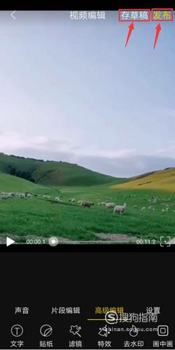返回视频编辑页面后,点击右上角的“存草稿”将视频保存至我的作品中,点击发布可以快速分享给好友。