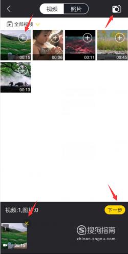 点击视频上的“+”导入需要截取的视频,点击“×”导出添加错误的视频,也可以点击右上角的“相机”图标,可以现场拍摄一段。视频导入成功后,点击“下一步”。