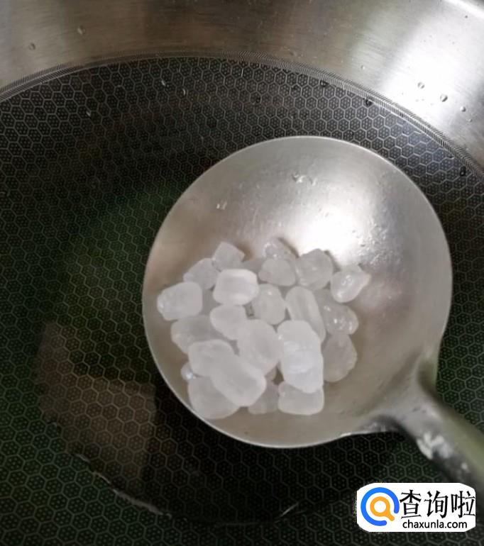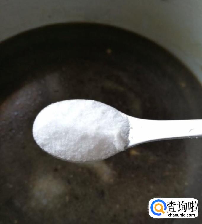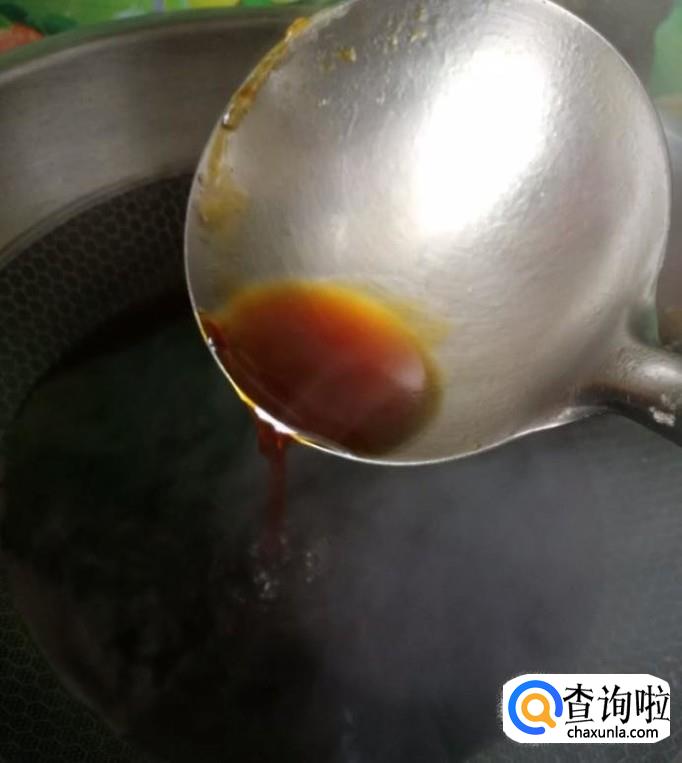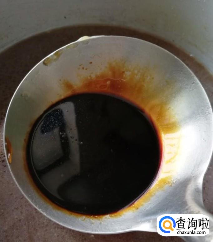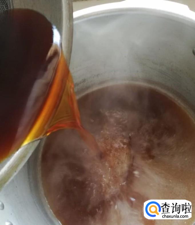 接着我们在锅中放入少许油,放入适量的冰糖,小火熬至焦糖色,倒入开水,搅拌均匀,将糖水倒入汤锅中