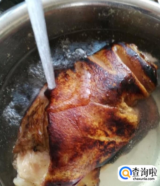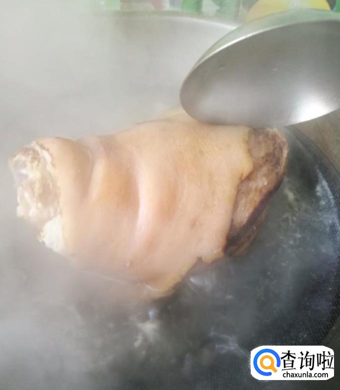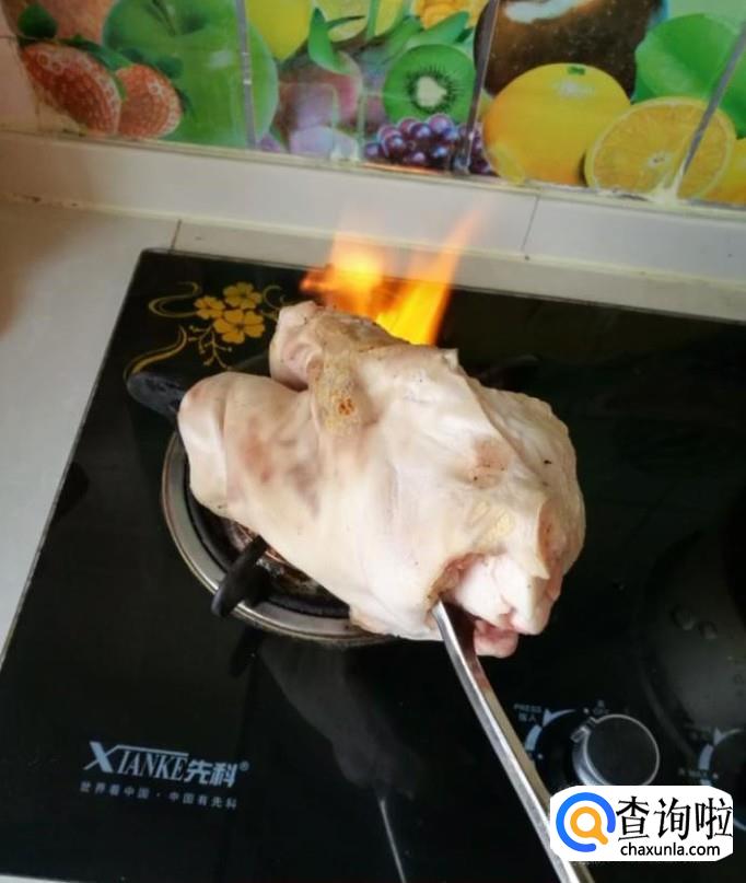 然后我们清理一下猪毛,用叉子叉起来,在火上烤一下猪毛与油脂,烧好以后清洗干净,放入热水锅中焯一下,捞出备用