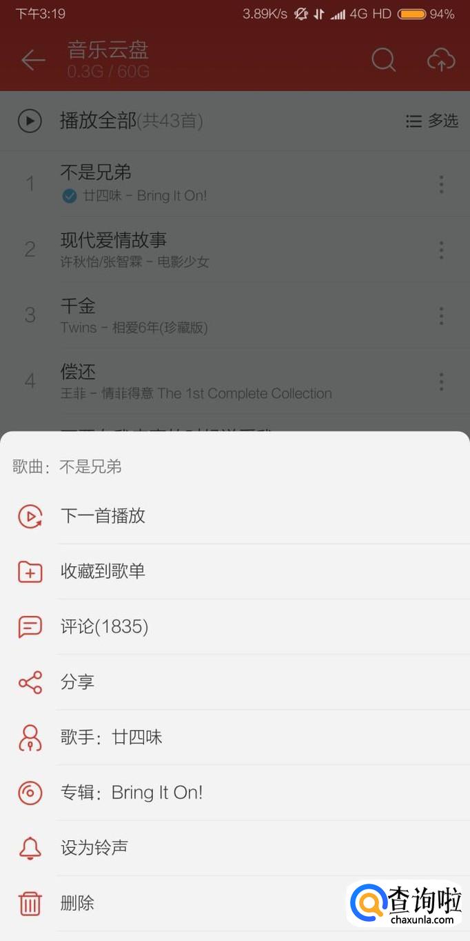 点击音乐文件名称右边的省略号图标,就可以把音乐云盘的音乐文件分享给别人或者设置为手机铃声。