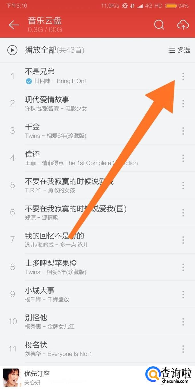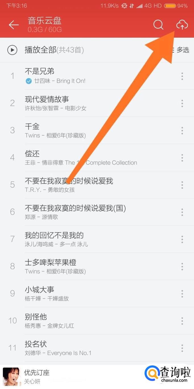 点击音乐云盘界面右上角的上传图标,就可以上传本地音乐文件到云盘中,节省手机存储空间。