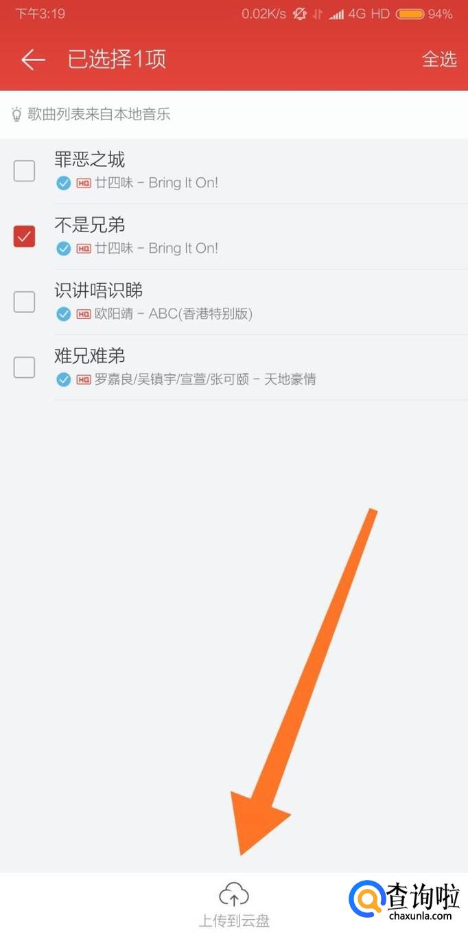 如需上传音乐,只选中需要上传的本地音乐文件,然后点击音乐云盘界面下方的“上传到云盘”即可永久保存在云盘中。