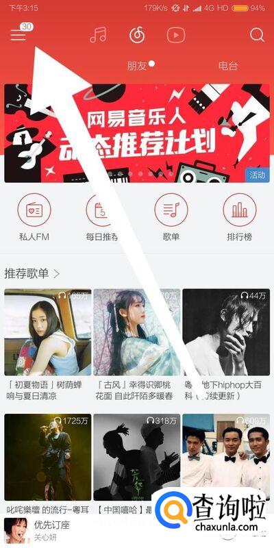 我们首先进入网易云音乐,点击软件界面的左上角省略号。