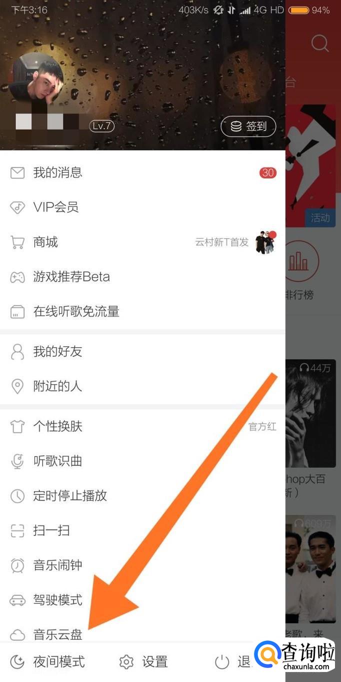 然后在弹出的菜单中,点击“音乐云盘”即可。