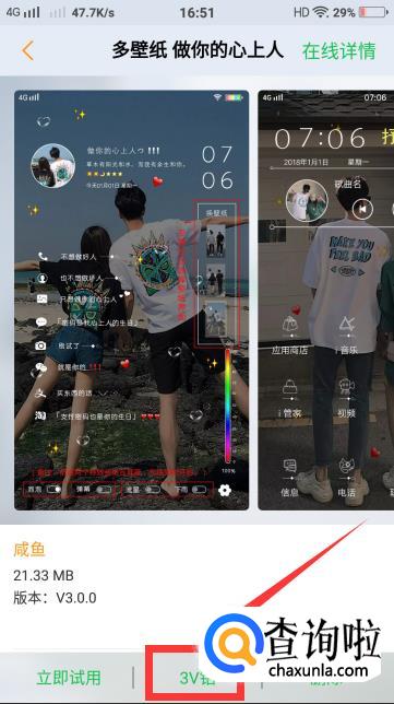 进入后,你可以左右划一下,看一下效果,也可以在该页面的左下角点击【试用】,然后点击【立即试用】,手机上面就会更换成新的壁纸,让你看看效果哦。