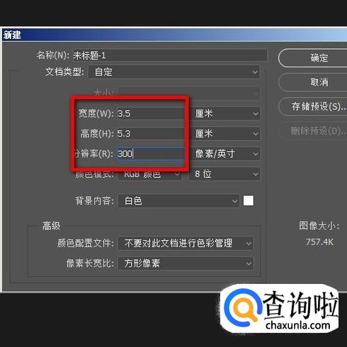 打开新建文档的界面,点击新建按钮,弹出新建文档对话框,再设置宽度为3.5厘米;高度为5.3厘米,分辨率为300;背景为白色;再点击确定。