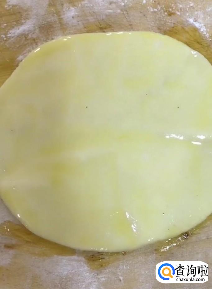 接着我们将醒发好的面擀成一个个小饼,刷上一层食用油油,再放上一张小饼,再刷油,四五张小饼一组,用擀面杖擀成大饼