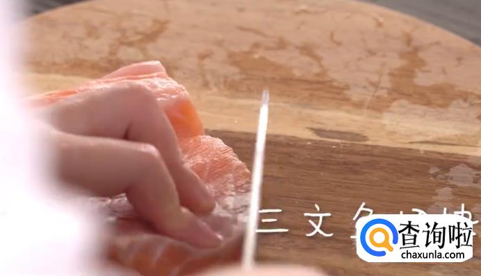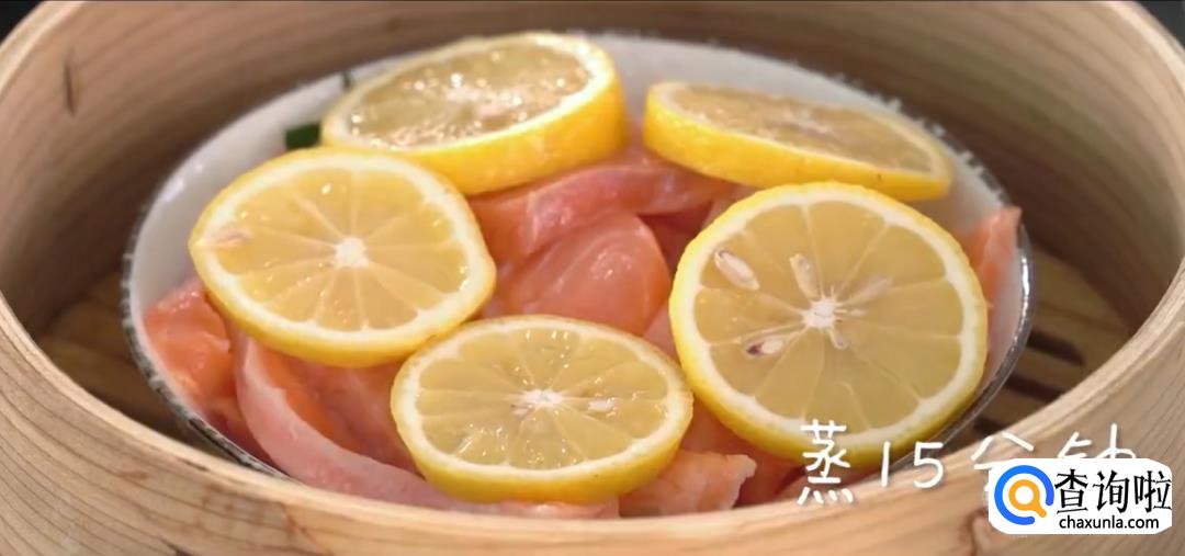 将三文鱼切块后盛入盘中,放入柠檬片,上锅蒸15分钟。