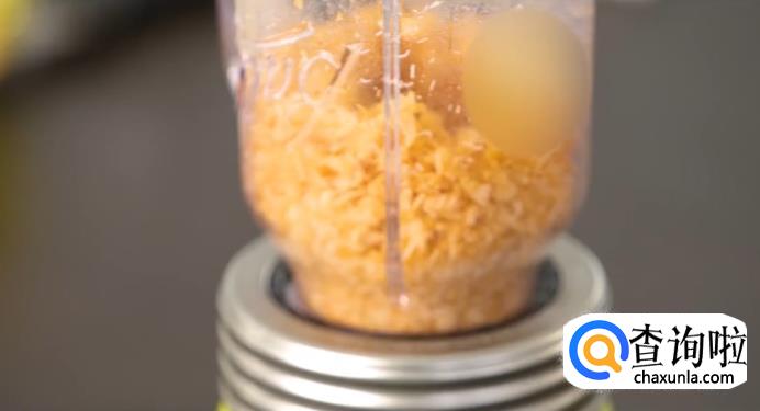 将捣碎的鱼肉放入不粘锅中,用小火不停的翻炒,炒至鱼肉表面干燥(兹兹声小了),放入料理机中打碎。