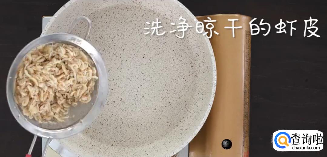 将洗净晾干的虾皮放入不粘锅中,炒干水分。