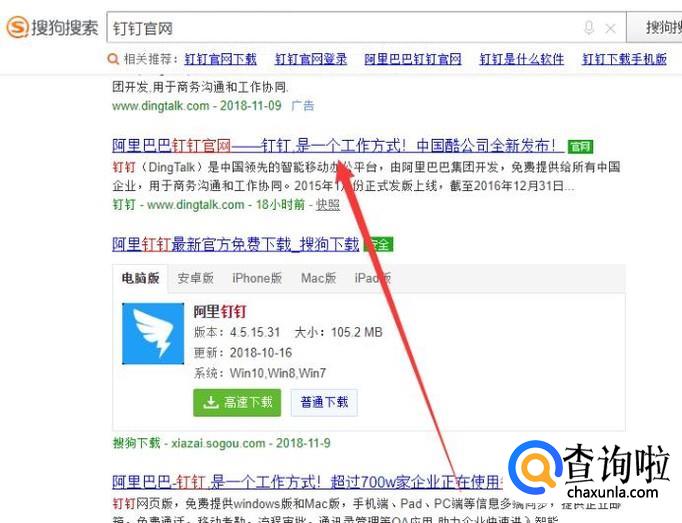 进入之后,搜索“钉钉官网”,点击并进入,如图所示。