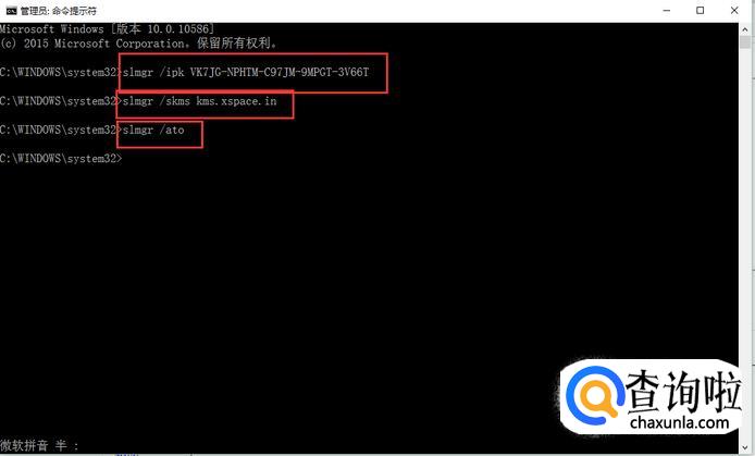 就会打开系统的“命令提示符”界面,在“C:WINDOWSsystem32>”后面输入依次输入“slmgr /ipk VK7JG-NPHTM-C97JM-9MPGT-3V66T”,“slmgr /skms kms.xspace.in”,“slmgr /ato”,每输入一个点击一次回车。