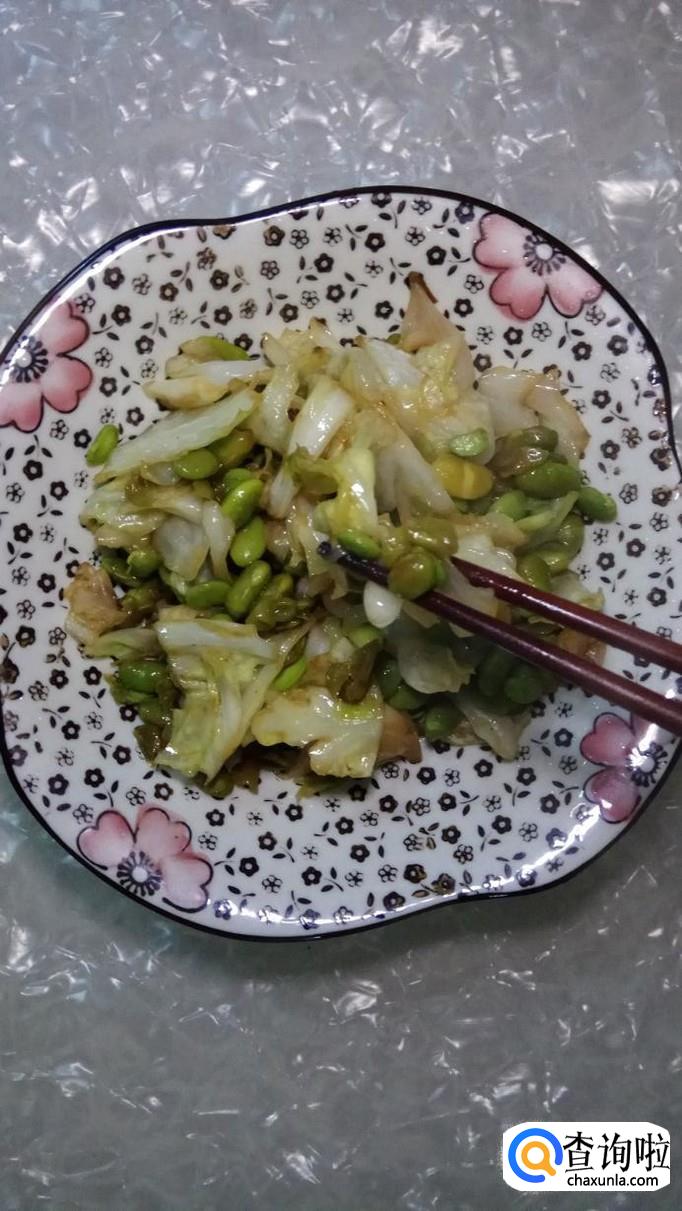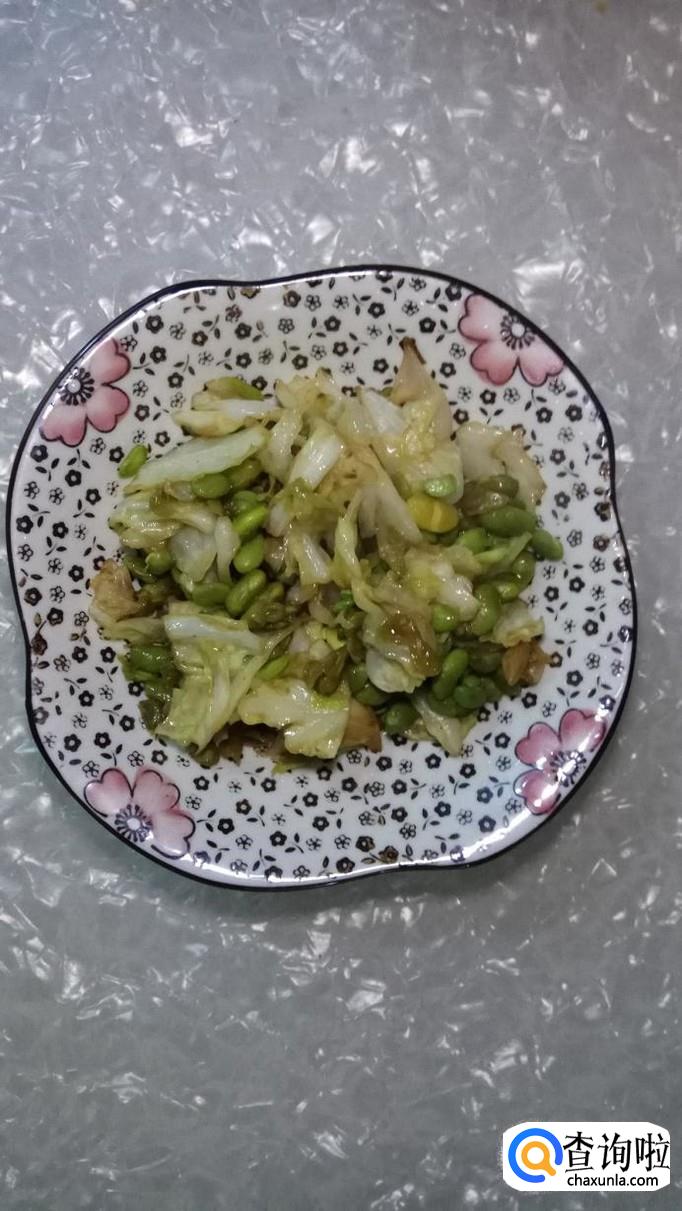 将洗好的包菜,放入锅中,和毛豆一起翻炒。