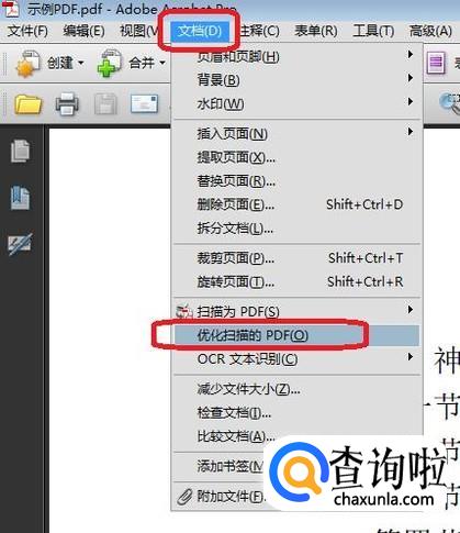 打开该文件,点击“文档”,下拉菜单中选择“优化扫描的PDF”。