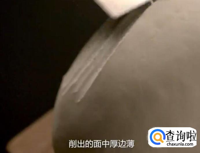 刀面与面团表面持平,用力均匀,将面一片片的削到开水锅中。