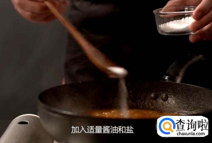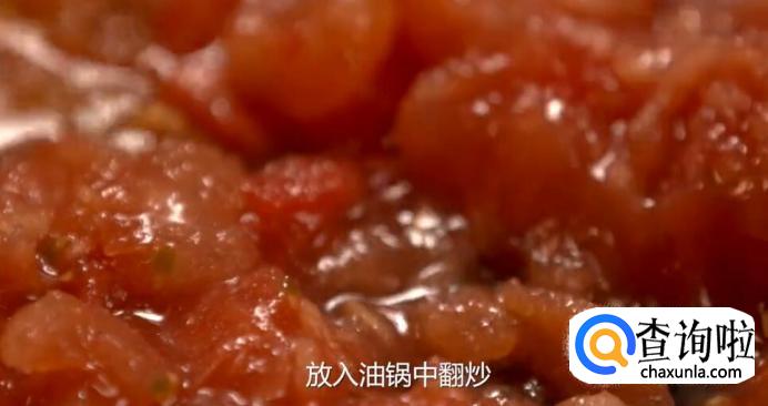 将番茄去皮,用手捏碎,放入油锅中翻炒。