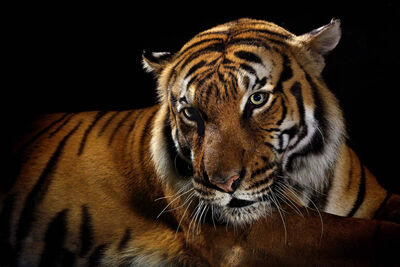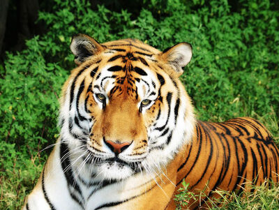 虎也被叫做老虎,是现如今体型最大的猫科动物也是处于食物链顶端的肉食动物之一。老虎通常长着棕黄的皮毛,上面有黑色条纹,脑门上的“王”字花纹无半圆形耳朵,愧于它们的丛林之王”的身份。在猫科动物中老虎有中长的犬齿和最大号的爪子,它们的爪子能刺入皮下11厘米深,牙齿能将猎物的骨头咬碎胡须刚硬、带尖。如手掌般大小的舌,上面生有倒刺。棕黄色的体毛,胸腹部毛色为乳白色,全身覆盖有黑色条纹。