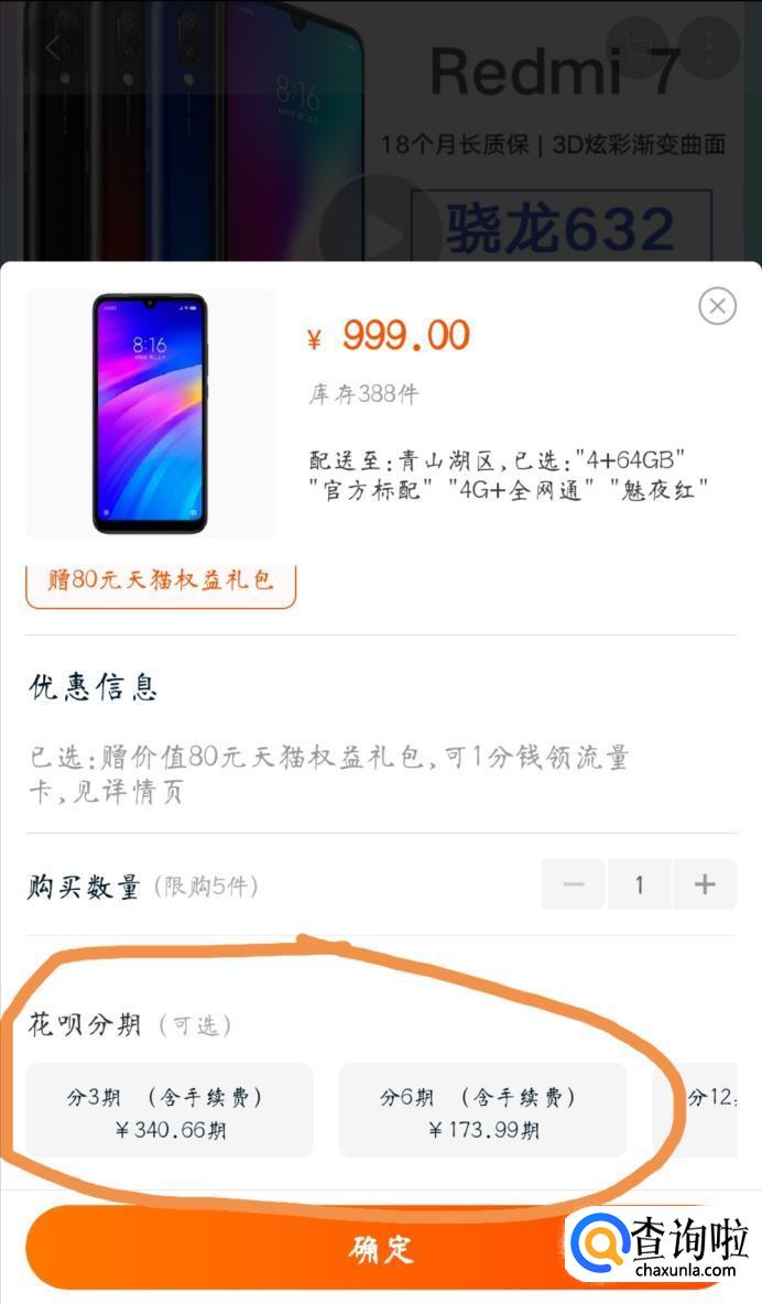 然后选择好物品的样式后,可以看到下方有分期付款的方式,选择一种适合自己的分期方式,点击确定,跳转进下一页面