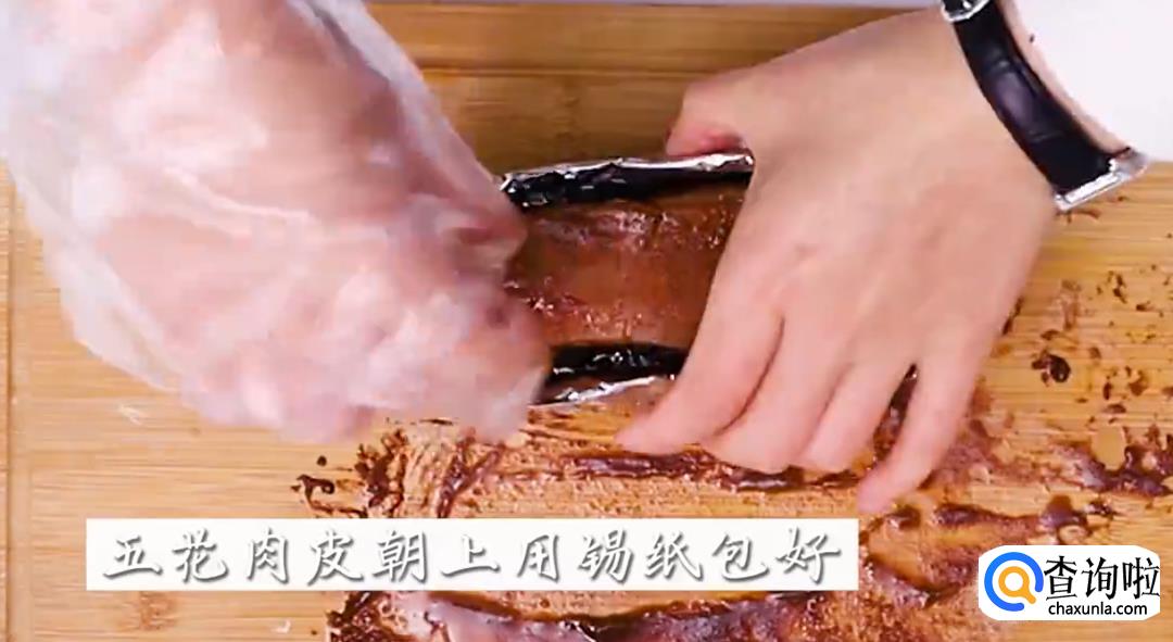 将肉皮朝上后,用锡纸把肉裹起来。