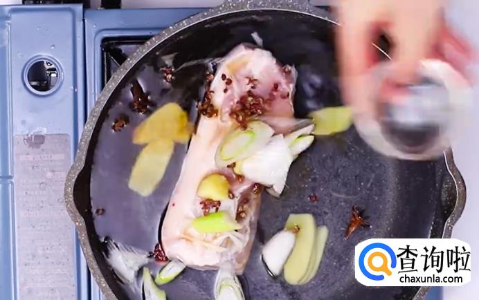 五花肉冷水下锅,然后放入姜片、葱片、八角、花椒和料酒,盖上锅盖开始煮。