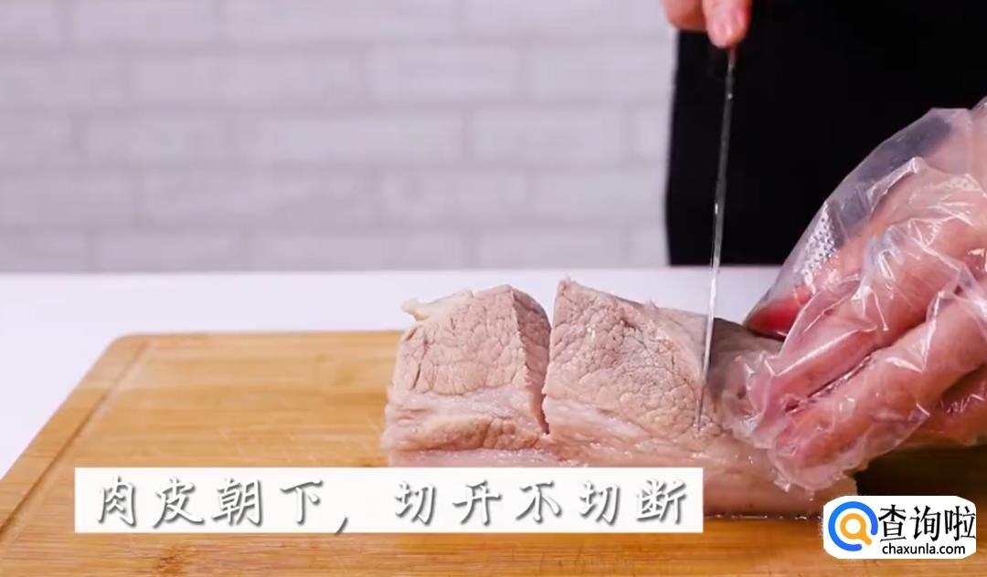 将肉翻过来,肉皮朝下,将肉切成几段,但是不要切断了肉皮。