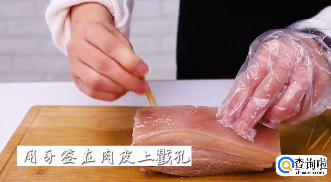 用牙签在肉皮上戳孔,后面让调料更加入味。