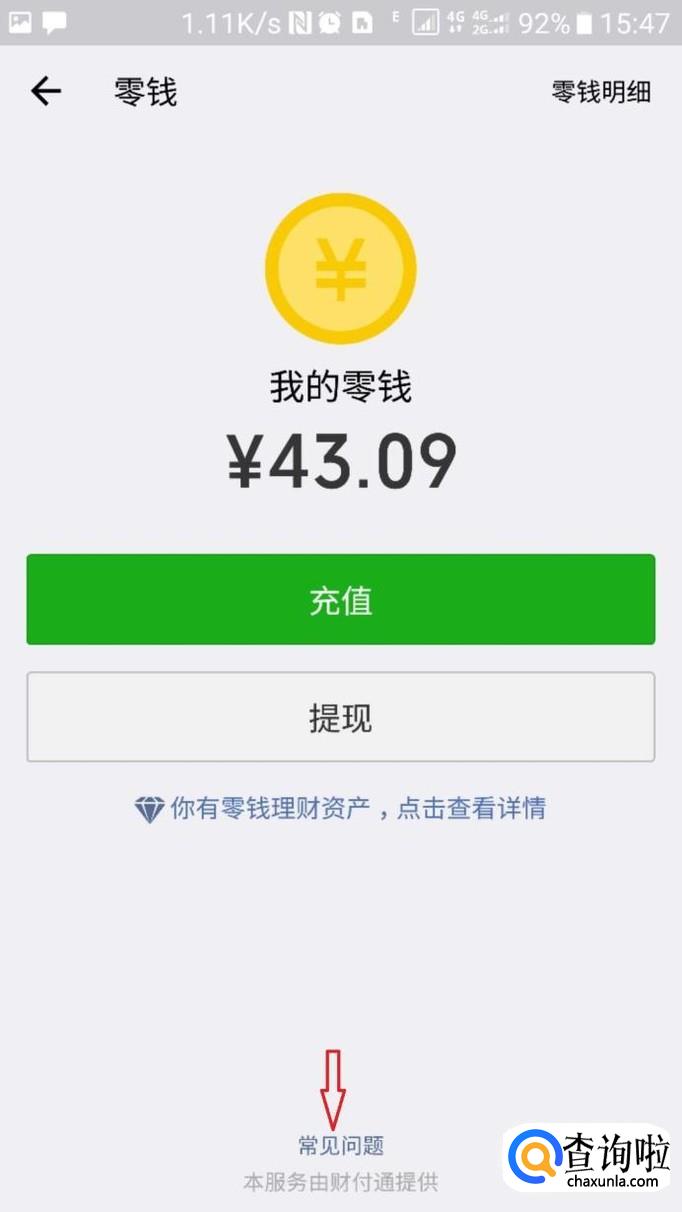 在“零钱”页面中找到正下方的“常见问题”按钮,点击进入;