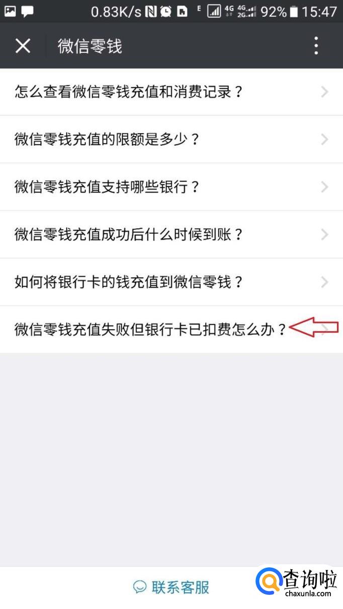 选择点击跳转页面中的最后一条“微信零钱充值失败但银行卡已扣费怎么办?”