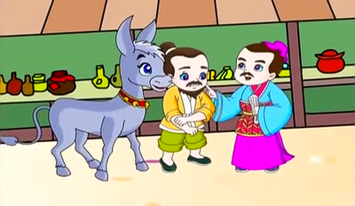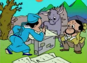 一天,博士家的驴子死了,他感叹道:“吾无马无车,唯以驴代步,一日不可缺也。”于是就到集市上去另买一头。他在牲口市上转来转去,东瞧西望,贵的买不起,贱的太瘦弱,最后终于找到一头合适的,讲好价钱,博士一手交银子一手拽住缰绳,想拉着驴就走。卖驴的农家老头急忙制止,说:“按规矩,必须立个字据。我不识字,看来您是有学问的人,就麻烦您写一份吧。”说着拿出早已准备下的纸笔。
