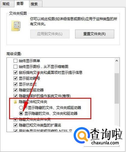 在“隐藏文件和文件夹”选项下找到“显示的文件、文件夹和驱动”,并在前面打勾。点击“应用”,再点击“确定”,那些隐藏的文件就出现啦!