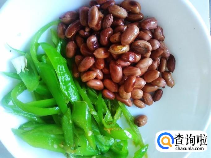 然后把青椒、花生铺上去,再浇适量的生抽。