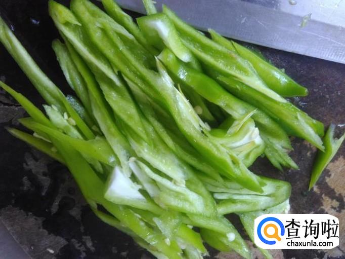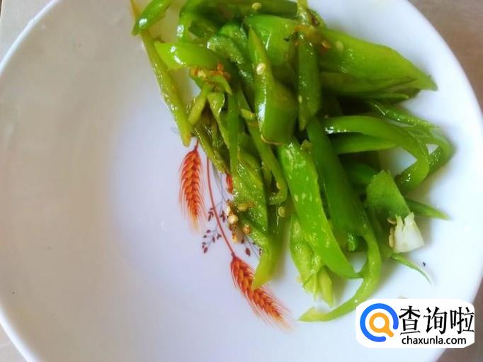 开火下油,放青椒进去加适量的盐翻炒至软,然后铲上碟子。